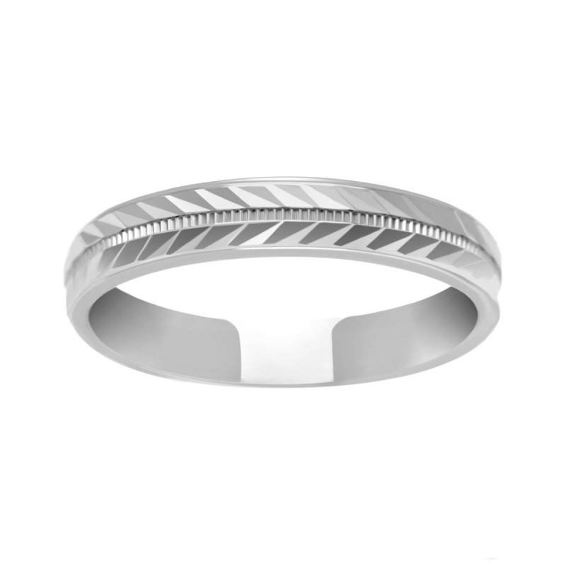 Élégante et singulière, cette alliance mixte en Argent 925/1000 se distingue par ses fines gravures en chevrons soulignées d’une ligne perlée centrale. Son motif rythmé incarne l’harmonie de deux destins qui s’entrelacent dans une parfaite symétrie.