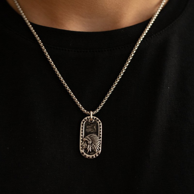 Ce bijou est façonné en acier gris, un matériau robuste et durable qui offre une esthétique brute et masculine. Le pendentif rond est finement gravé du portrait d'un chef indien, dont les détails soignés confèrent à la pièce une allure élégante et pleine d'authenticité. D'un poids de 16,76 grammes, le collier est monté sur une chaîne dont la longueur est ajustable de 50 à 60 cm pour un confort parfait, et sécurisée par un fermoir mousqueton pratique.