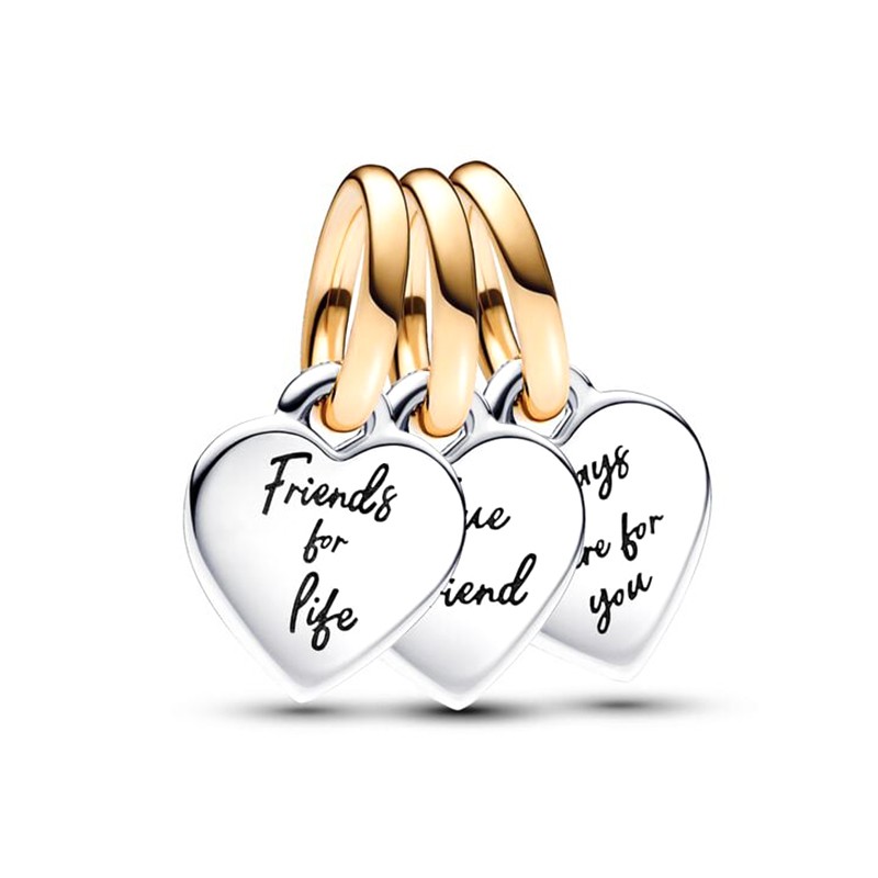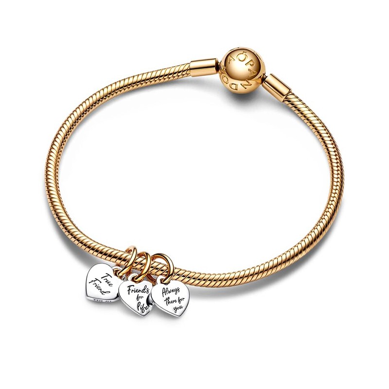 Confectionné à partir de métal doré 585/1000 (14 carats) et Argent 925/1000, ce charm présente trois cœurs séparables, chacun portant un message d'amitié et d'amour. Ce design ingénieux permet de partager ce charm avec deux personnes chères, symbolisant votre lien unique et inaliénable.