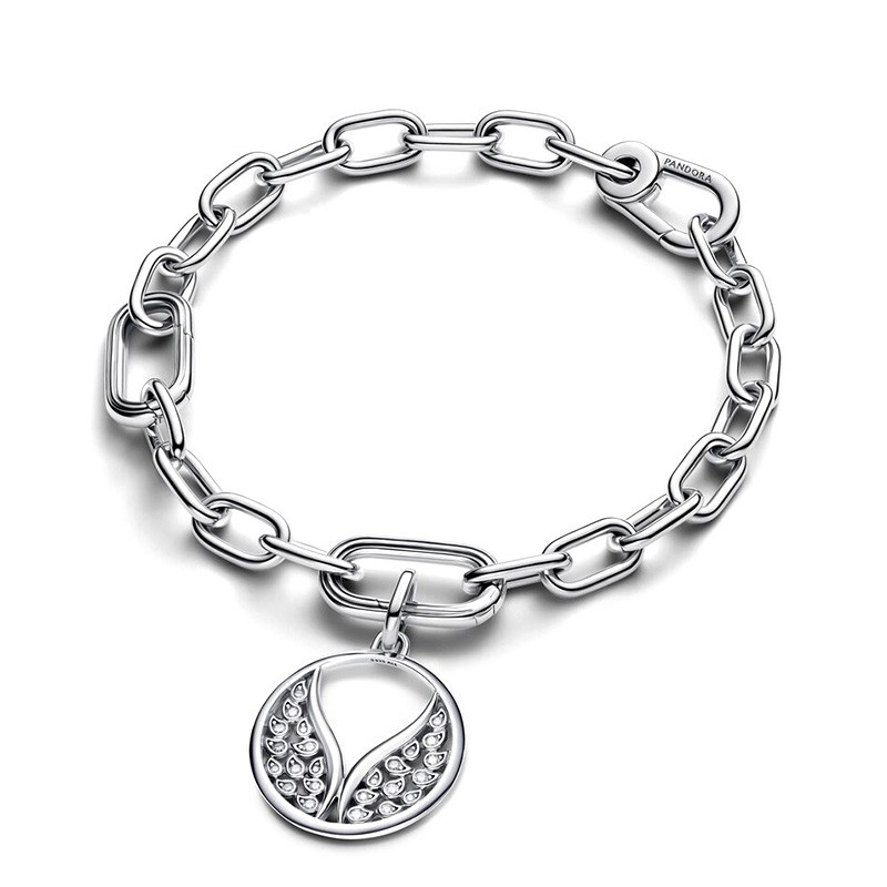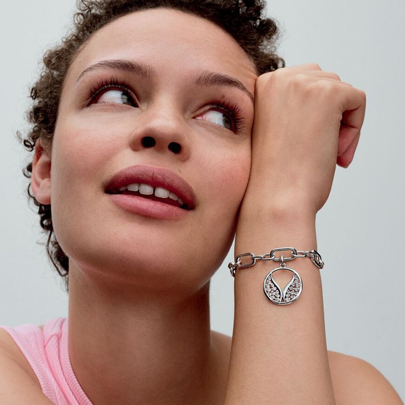 Symbole de liberté, de protection et d’élévation, le Charm Médaillon Grandes Ailes Pandora ME incarne l’élégance spirituelle. En argent 925/1000e, ce charm circulaire révèle deux grandes ailes stylisées, incrustées de 28 oxydes de zirconium scintillants qui capturent magnifiquement la lumière à chaque mouvement.