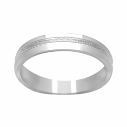 Cette alliance mixte en Argent 925/1000 séduit par son style sobre et travaillé. Son motif lapidé central, délicatement ciselé en creux, évoque la finesse des promesses échangées lors du plus beau jour d’une vie.