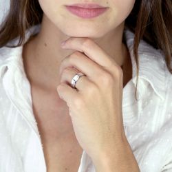 Avec un poids moyen de 5.00 g, cette bague présente une finition satinée contrastée par la brillance de ses diamants sertis en rail, garantissant un rendu à la fois moderne et raffiné.