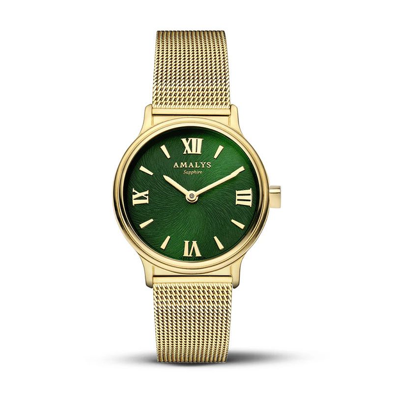 Avec son esthétique intemporelle rehaussée d’un twist chromatique audacieux, la montre Yvette s’impose comme un indispensable du vestiaire féminin contemporain. Son boîtier de 28 mm en acier inoxydable doré 316L encadre un cadran vert profond, vibrant et lumineux, dont les reflets évoquent un feuillage précieux animé par la lumière. Les chiffres romains dorés, parfaitement équilibrés, rythment le cadran avec discrétion et raffinement, tandis que les aiguilles fines soulignent la délicatesse du modèle.
