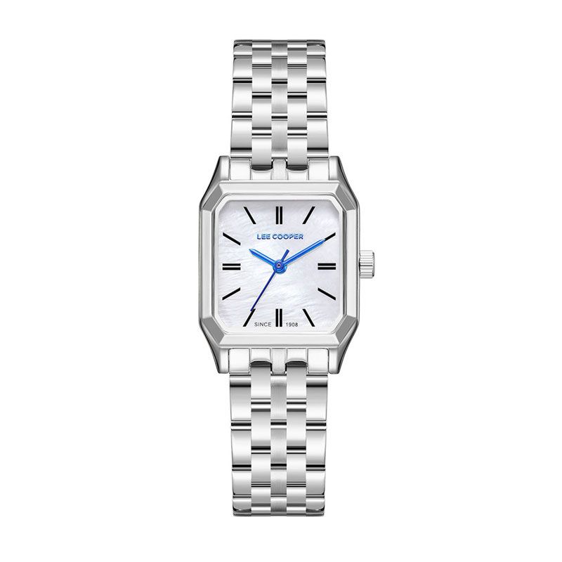 Montre Femme LEE COOPER Acier Argenté LC08120.320 séduit par son design élégant mêlant modernité et tradition. Son boîtier rectangulaire en métal argenté de 14x14 mm s’harmonise parfaitement avec un cadran nacré blanc délicat, sublimé par des aiguilles bleues pour une touche de sophistication unique. Le bracelet en métal argenté complète ce bijou d’horlogerie, offrant confort et style.