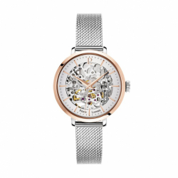 Son boîtier en acier inoxydable argenté de 35 mm, subtilement rehaussé d’une lunette doré-rose, encadre un cadran squelette délicatement ajouré, dévoilant le mouvement automatique en parfaite harmonie avec chaque mouvement du poignet. Les index bâtons et aiguilles doré-rose ajoutent une touche de raffinement supplémentaire, faisant de cette montre un véritable bijou.