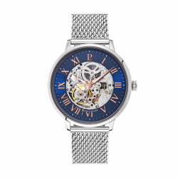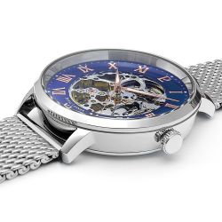 Le point fort de cette montre réside dans son cadran squelette, qui révèle la beauté de son mécanisme automatique en parfaite harmonie avec un anneau bleu profond où s’intègrent de somptueux index en chiffres romains doré-rose. Cette profondeur visuelle unique en fait une pièce d’exception pour les passionnés de montres.
