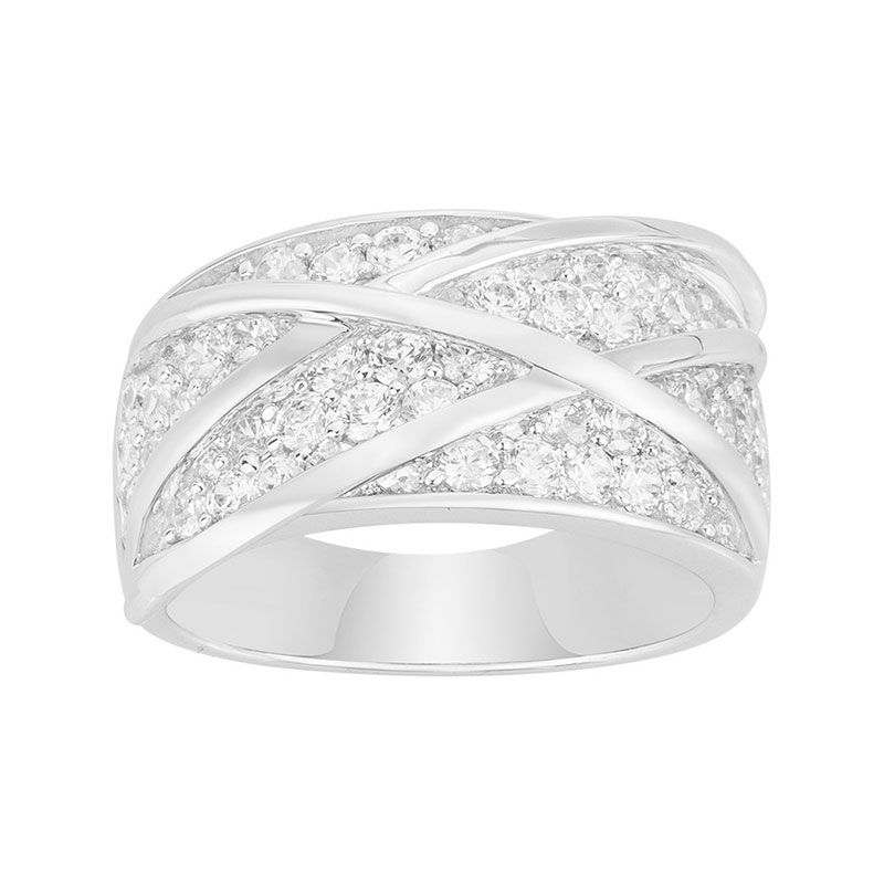 Éblouissante et contemporaine, cette alliance femme en Argent 925/1000 capture tous les regards grâce à ses 61 oxydes de zirconium subtilement sertis. Son design graphique enchevêtre des lignes d’argent poli entrelacées à de larges pavages lumineux, créant une composition étincelante à la fois structurée et aérienne.