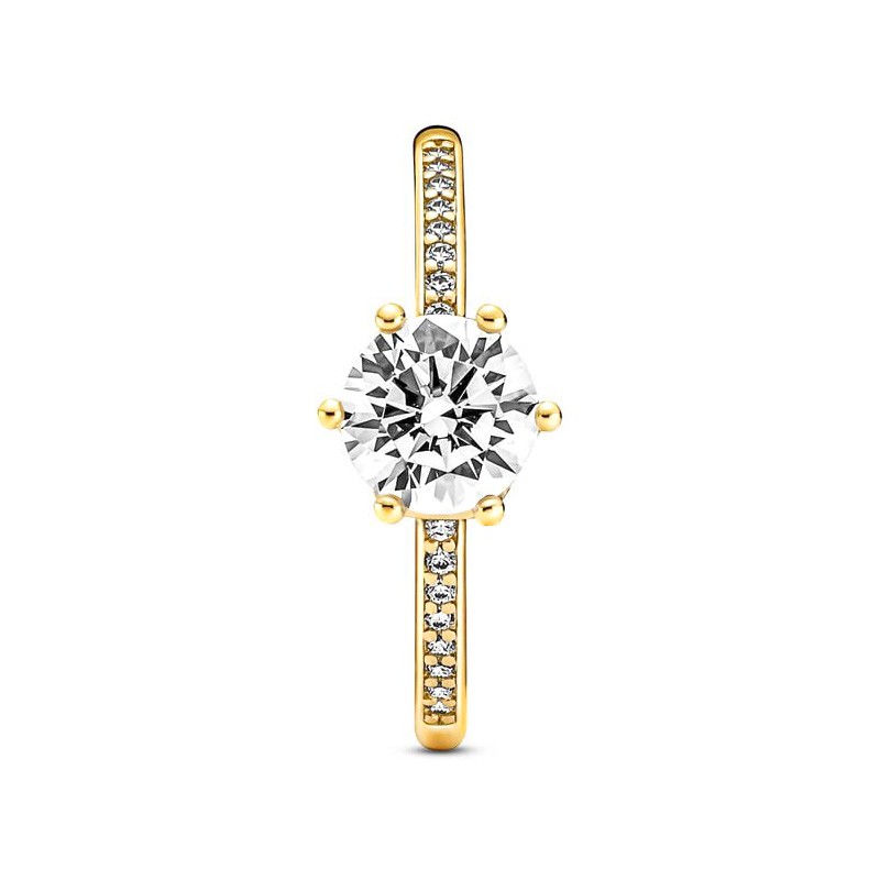 Couronnez vos moments les plus précieux avec cette somptueuse bague Pandora, dorée à l’or 585/1000e, conçue comme un véritable hommage à l’élégance royale. En son centre, un oxyde de zirconium incolore, taillé avec précision, est sublimé par un serti griffes façon couronne pour capturer la lumière avec éclat. L’anneau, lui aussi paré de pierres scintillantes, renforce la majesté de ce bijou digne d’une reine.