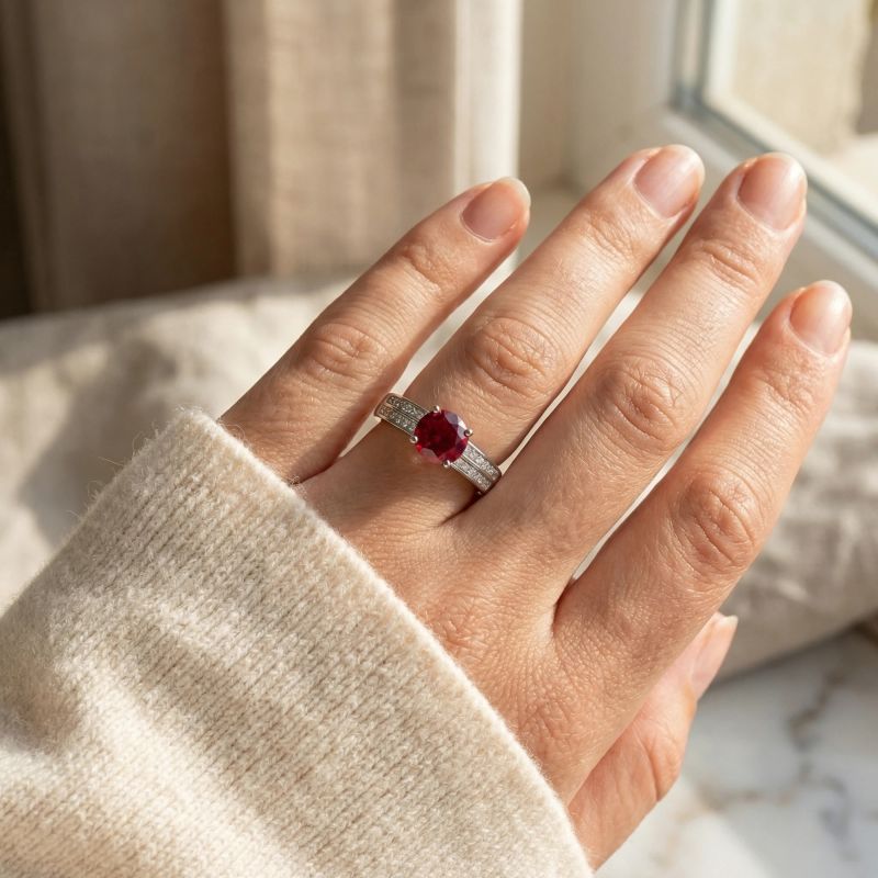 Le design de cette bague repose sur un motif central majestueux : une superbe spinelle rouge de taille ronde, aux reflets profonds et envoûtants, est maintenue par quatre griffes robustes. Ce solitaire est magnifiquement "accompagné" par un anneau large au profil moderne, dont les épaules sont ornées d'un double rang d'oxydes de zirconium scintillants. Ce pavage géométrique apporte une brillance continue et un contraste éclatant avec le rouge vibrant de la pierre centrale, offrant une silhouette à la fois classique et audacieuse.