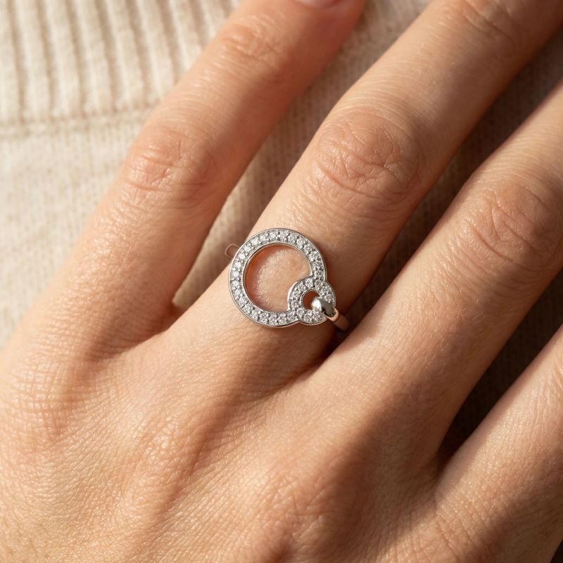 Le style de cette bague repose sur un motif central original composé de deux cercles asymétriques entrelacés. Le cercle principal, d'un diamètre généreux, est entièrement pavé d'oxydes de zirconium scintillants, tandis qu'un second cercle plus petit vient s'y greffer avec élégance. Un délicat cavalier d'argent lisse vient lier ces deux éléments, apportant un relief sophistiqué et une touche de contraste minimaliste à l'ensemble. Cette esthétique aérienne habille la main avec une distinction contemporaine et lumineuse.