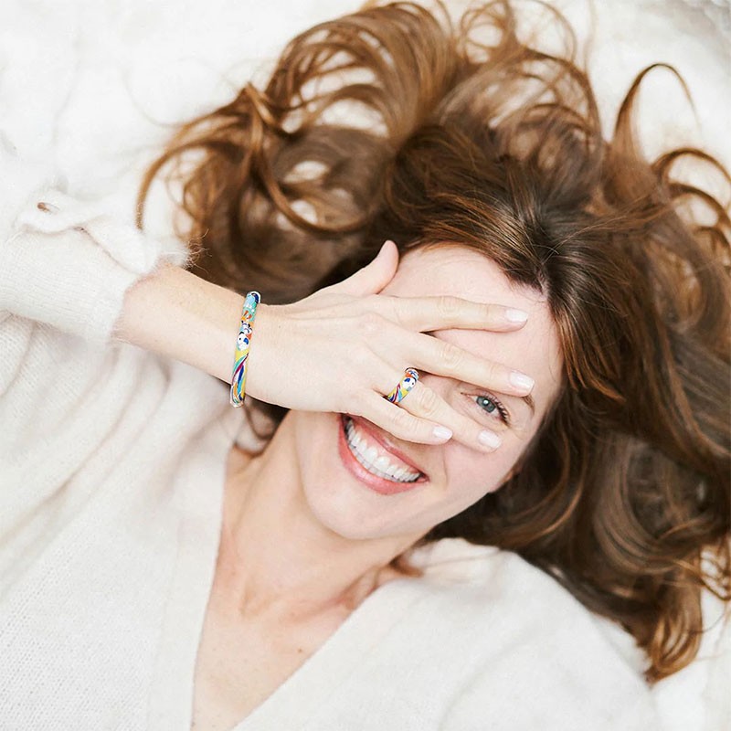 Avec une largeur de 7,80 mm et une épaisseur de 4,80 mm, cette bague offre une présence remarquable tout en garantissant un confort optimal au quotidien. Sa silhouette légèrement bombée épouse délicatement la courbe du doigt, tandis que les détails éclatants de couleurs apportent une touche de fantaisie maîtrisée. Chaque motif évoque la richesse d’un plumage tropical, pour une allure affirmée, joyeuse et toujours raffinée.