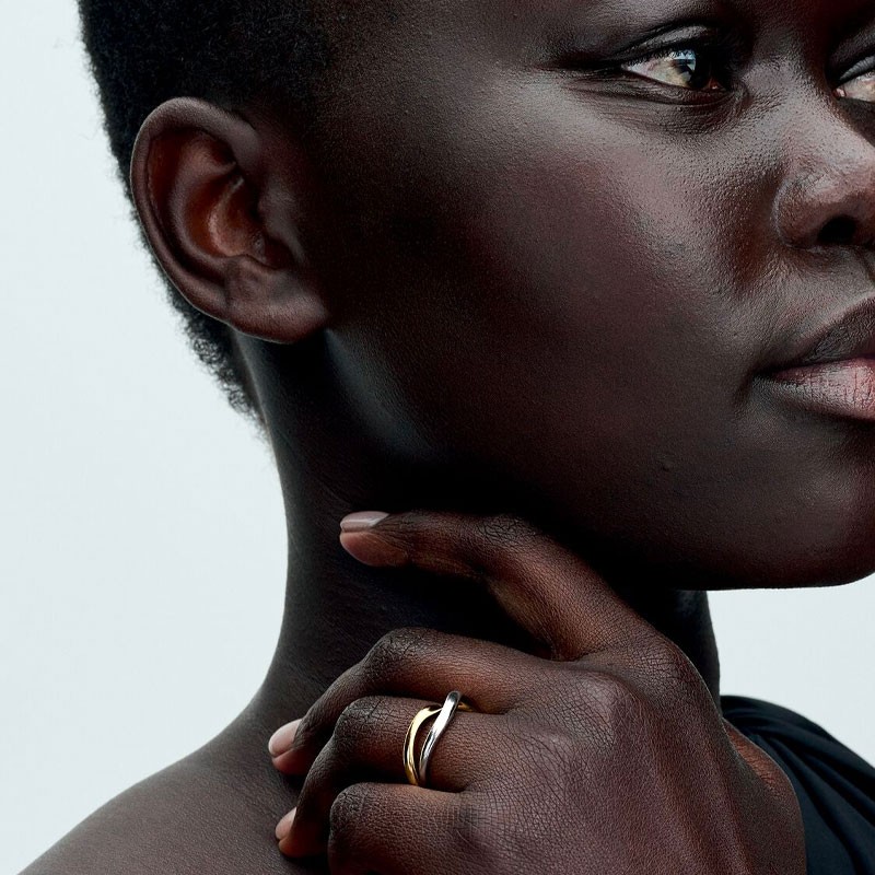 Cette bague se distingue par son architecture moderne où l'entrelacement des anneaux symbolise l'union et la complémentarité. Le mariage de l'argent et de l'or doré résout le dilemme du choix de couleur, permettant de s'harmoniser avec tous les bijoux de votre collection. Les ondulations subtiles ajoutent une dimension organique au design, créant des jeux d'ombre et de lumière qui animent la surface métallique.