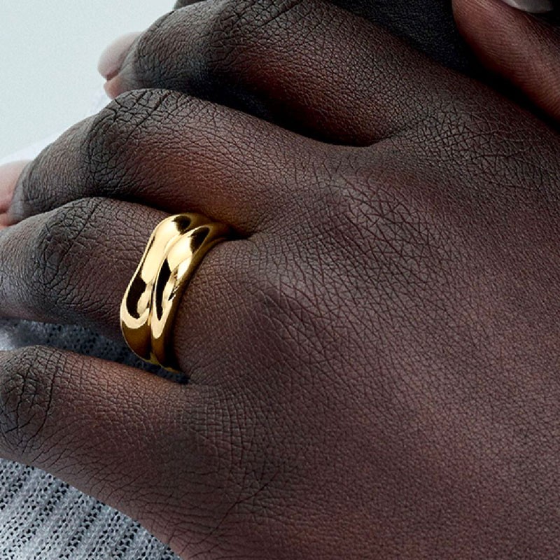 Ce set se distingue par ses variations intentionnelles qui rendent chaque superposition unique. La dorure à l'or 14 carats assure un éclat doré durable et chaleureux qui résiste au temps. Les formes organiques irrégulières apportent une touche artisanale moderne, évoquant les ondulations naturelles de l'eau ou du sable. La possibilité de les porter séparément double les options de style, permettant de les mixer avec d'autres bagues de votre collection.