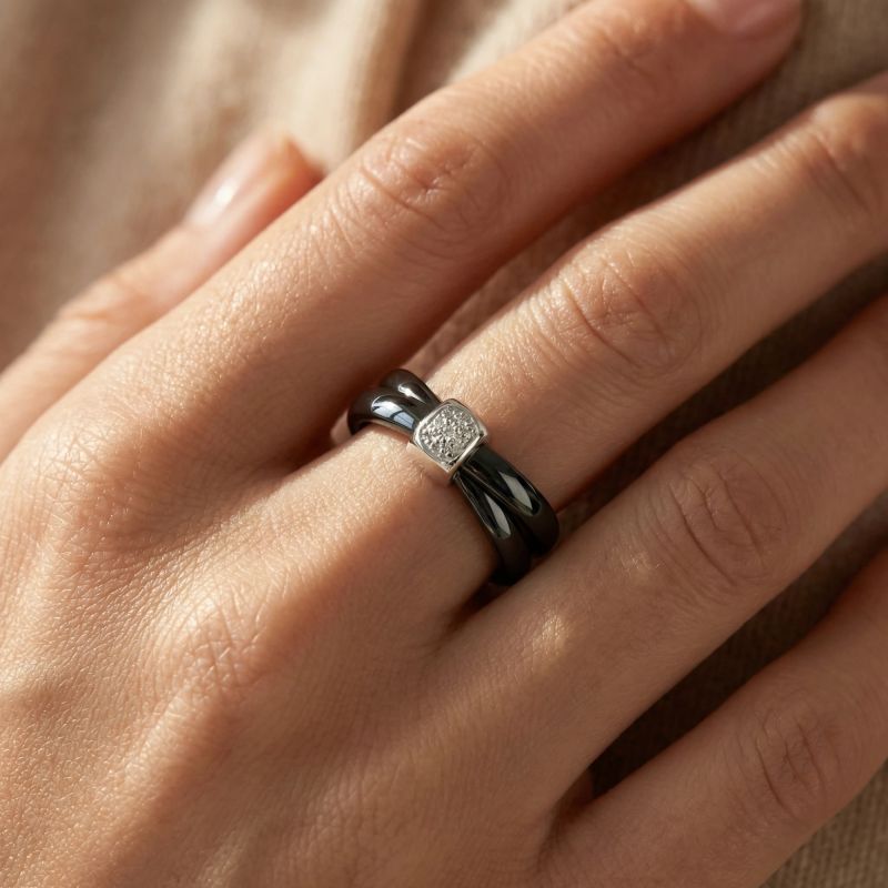 Cette bague femme est une pièce d'une modernité absolue, jouant sur le contraste des matières et des couleurs pour un style à la fois chic et audacieux. Son design entrelacé combine la pureté de l'argent avec la profondeur de la céramique noire, rehaussé par l'éclat précieux du diamant.