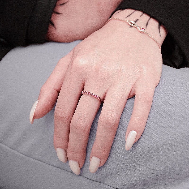 Ce bijou est façonné en plaqué or jaune de haute qualité, assurant une finition durable et une teinte chaleureuse qui contraste magnifiquement avec le rouge des pierres. L'anneau est finement serti de 10 oxydes de zirconium d'un rouge profond et éclatant, disposés en demi-tour. Le choix du plaqué or permet d'allier l'aspect luxueux à une grande résistance pour un usage fréquent.
