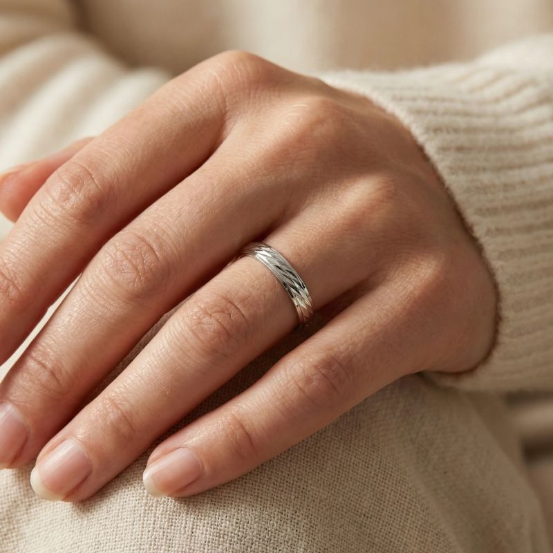 Avec sa texture ciselée en losanges raffinés, cette alliance mixte en Argent 925/1000 offre un jeu de lumière saisissant. Sa surface facettée évoque les éclats d’un amour sincère et durable, dans un style à la fois moderne et intemporel.