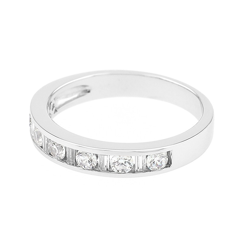 Symbole éclatant d’un amour éternel, cette bague femme en Or 750/1000 blanc sublime la main par l’éclat raffiné de ses 13 diamants en demi-tour. L’alternance harmonieuse de pierres rondes et de diamants baguette (0,53 ct GH-SI) offre un jeu de lumière saisissant, à la fois moderne et intemporel.