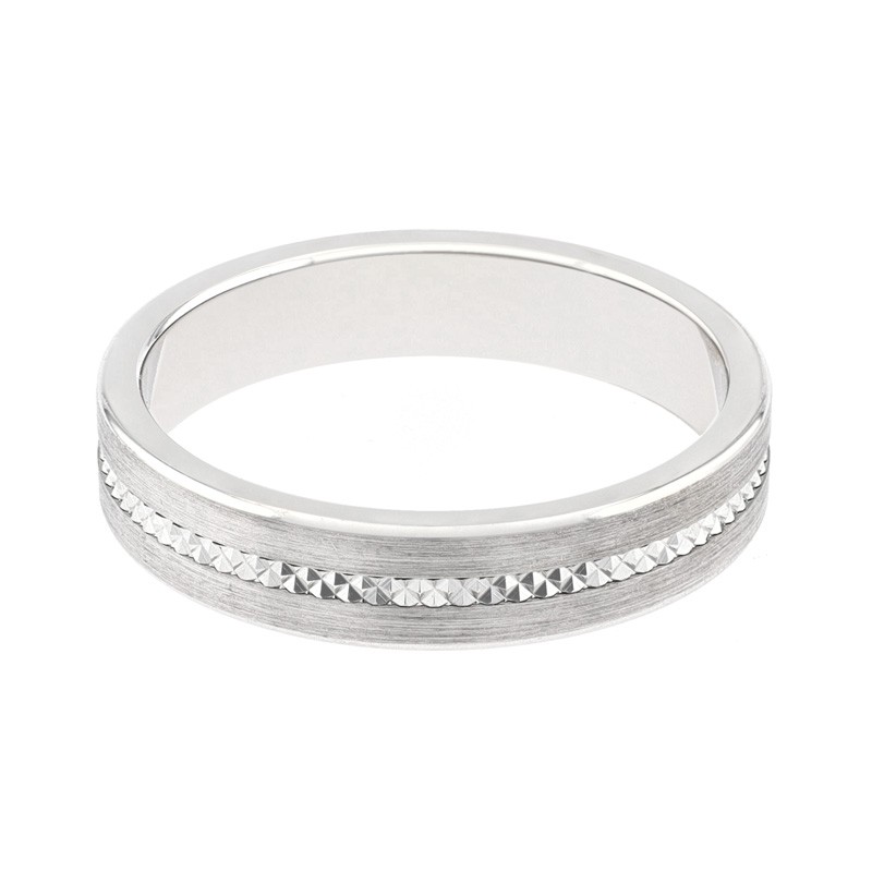Épure et modernité caractérisent cette alliance en Or 750/1000, sublimée par une finition satinée et un discret motif diamanté central. La texture brossée, traversée d’un léger relief ciselé, lui confère une allure singulière, à la fois sobre et raffinée.