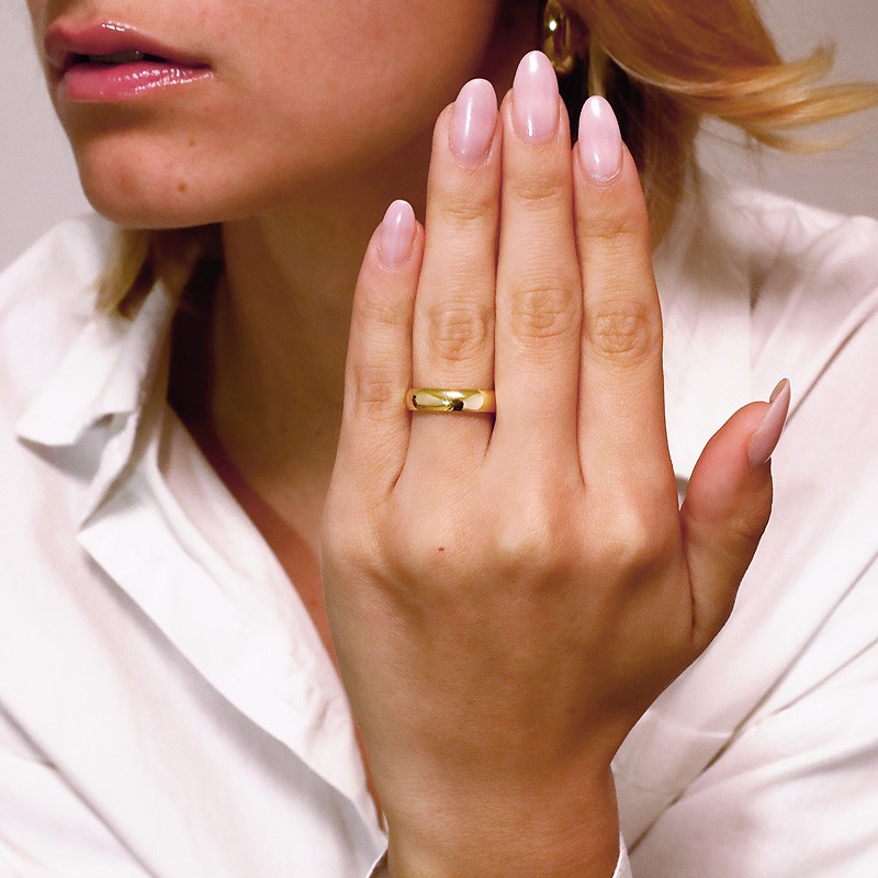 Avec ses courbes pleines et son éclat solaire, cette alliance en or jaune 18 carats incarne la chaleur d’un engagement fort et sincère. Son profil bombé et sa finition poli miroir révèlent toute la noblesse du métal précieux, sublimé par une structure intérieure confort pensée pour durer.