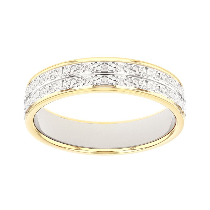 Le design de cette bague repose sur l'attrait d'une composition rythmée et lumineuse : l'anneau présente un large ruban central en or gris palladié, magnifié par un travail de ciselure "fantaisie" qui crée des facettes étincelantes. Ce centre scintillant est encadré par deux bordures lisses en or jaune à la finition polie miroir, soulignant le relief graphique de la pièce. Avec une largeur de 4,5 mm et une épaisseur de 1,3 mm, cette alliance offre une présence visuelle affirmée tout en assurant un confort idéal pour un porté quotidien.