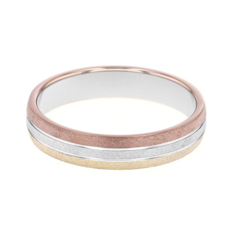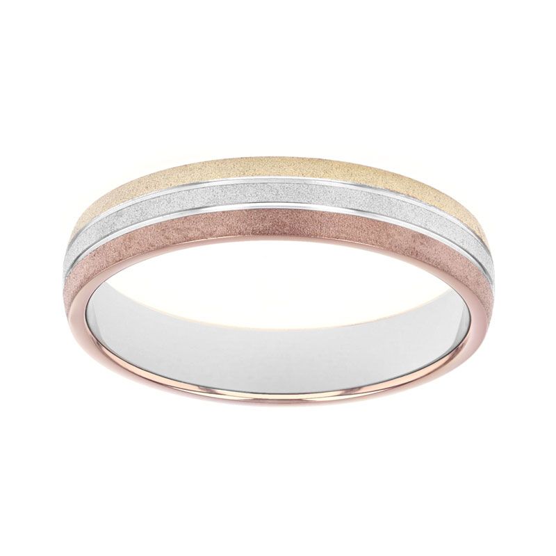 Le design de cette bague repose sur l'attrait d'une composition graphique et rythmée : l'anneau est formé par la superposition de rubans d'ors colorés, créant un jeu de nuances captivant sur toute sa circonférence. Sa silhouette est sublimée par une finition sablée qui offre une texture mate sophistiquée, contrastée par de fines bordures polies qui capturent la lumière avec subtilité. Avec une largeur de 4,5 mm et une épaisseur de 1,4 mm, cette alliance offre une présence visuelle souveraine tout en garantissant un confort idéal au porté.