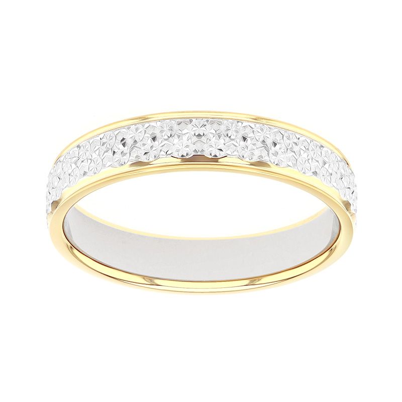 Le design de cette bague repose sur l'attrait d'une composition rythmée et lumineuse : l'anneau présente un bandeau central en or gris palladié, magnifié par un travail de ciselure "fantaisie" en biseaux qui crée des facettes étincelantes capturant la lumière à chaque mouvement. Ce centre scintillant est encadré par deux bordures lisses en or jaune à la finition polie miroir, soulignant le relief graphique et la bicoloration de la pièce. Avec une largeur de 4 mm et une épaisseur de 1,3 mm, cette alliance offre une silhouette équilibrée et un confort idéal pour un porté quotidien.