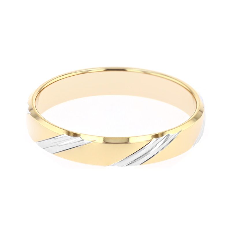 Le design de cette bague repose sur l'attrait d'une composition rythmée et lumineuse : l'anneau présente un bandeau central en or blanc rhodié, magnifié par un travail de ciselure "fantaisie" qui crée des motifs de feuilles ou de facettes étincelantes. Ce centre contrasté est encadré par deux bordures lisses en or jaune à la finition polie miroir, soulignant le relief et la bicoloration de la pièce. Avec une largeur de 4 mm et une épaisseur de 1,25 mm, cette alliance offre une présence visuelle affirmée tout en assurant un confort idéal pour un porté quotidien.