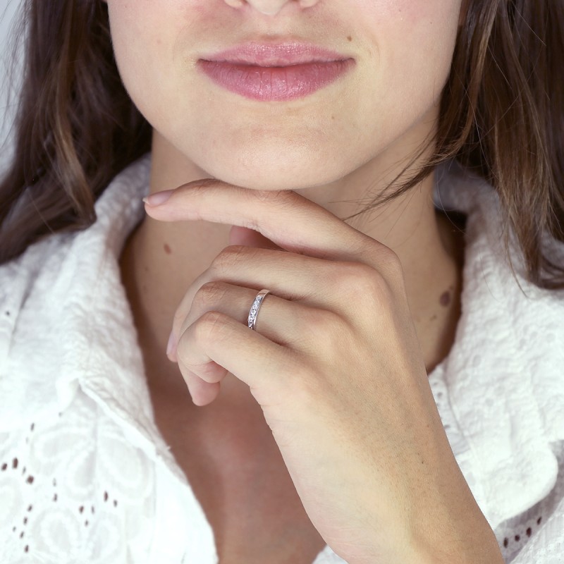 Élégance et éclat s’unissent dans cette alliance femme en or 750/1000 blanc, un bijou raffiné qui scelle la promesse d’un amour éternel. Son design épuré est sublimé par un serti rail accueillant 11 diamants naturels de qualité HSI, pour un total de 0,20 carat, diffusant une lumière éclatante à chaque mouvement.