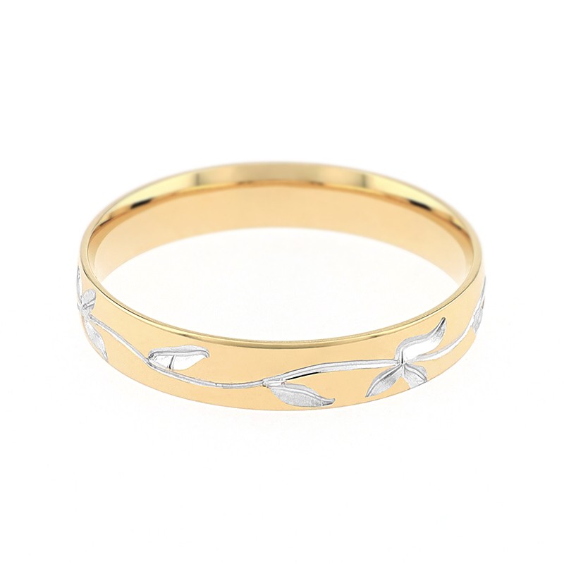 Symbole d’un amour en pleine floraison, cette alliance femme en or 750/1000 bicolore arbore un motif délicat de feuilles en or blanc, s’enlaçant harmonieusement autour d’un anneau en or jaune éclatant.