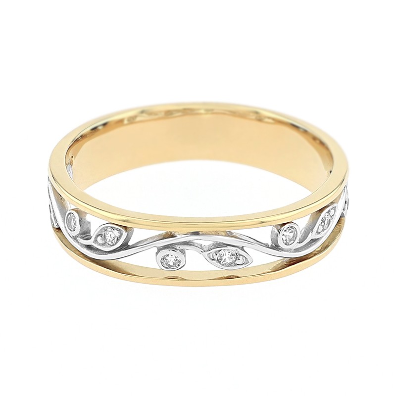 Symbole de romantisme et de délicatesse, cette alliance femme en or 375/1000 bicolore séduit par son motif floral ajouré, délicatement souligné de diamants naturels (0,06 ct, qualité HSI). L’harmonie du design bicolore met en lumière chaque détail de la pièce, offrant un éclat subtil et raffiné.