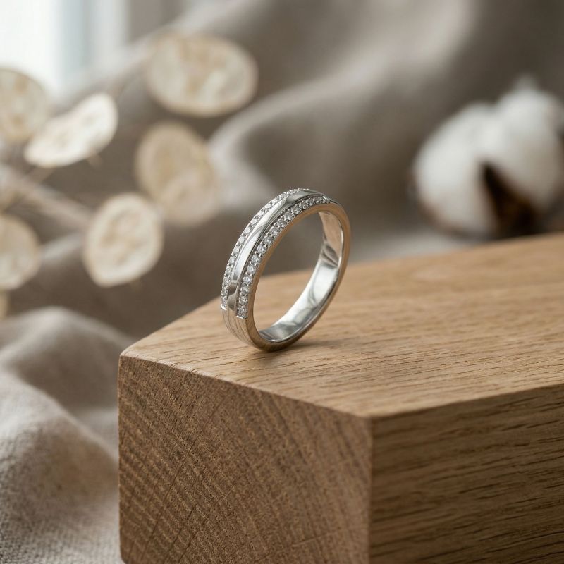 Dessinée pour capturer l’essence de l’élégance féminine, cette alliance femme en Argent 925/1000 se distingue par son double rang de pierres en oxyde de zirconium, méticuleusement serties. Un éclat délicat qui reflète l’intensité des promesses échangées.
