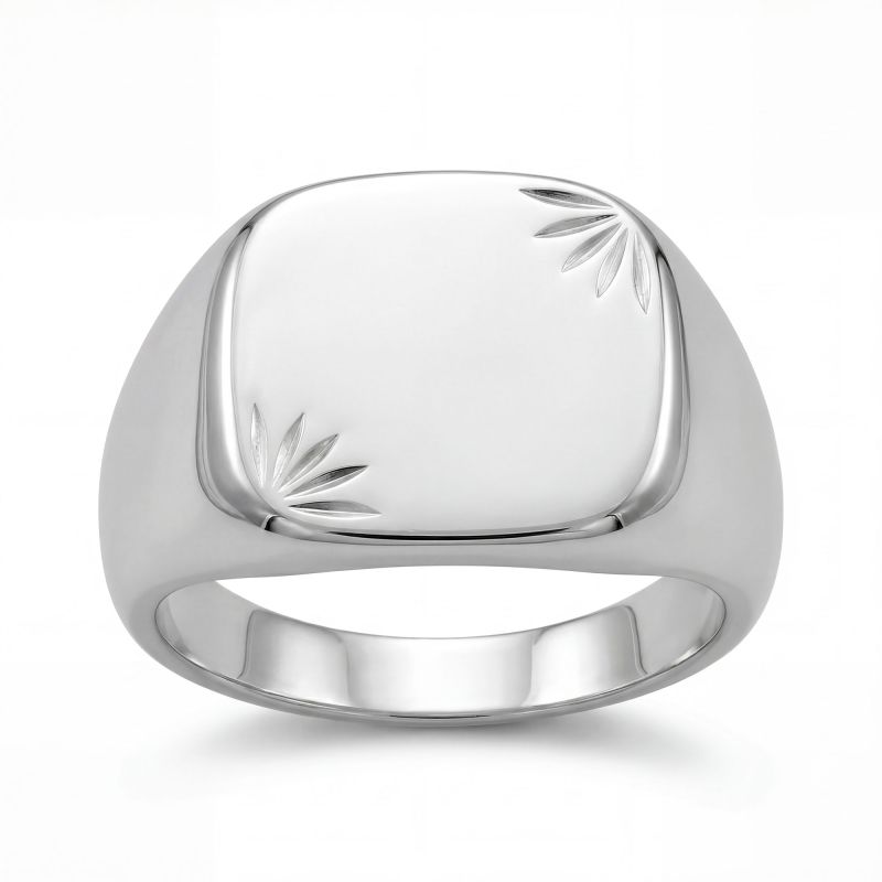 Le design de cette chevalière repose sur un plateau carré aux angles doucement arrondis, créant une silhouette robuste mais fluide qui s'adapte harmonieusement à la main. Pour une touche de raffinement supplémentaire, deux motifs soleil ou rayons sont délicatement gravés aux extrémités opposées du plateau, apportant une texture graphique et un détail visuel subtil à l'argent poli. La surface lisse du plateau offre une esthétique minimaliste et prestigieuse, idéale pour un porté quotidien ou pour marquer une occasion spéciale.