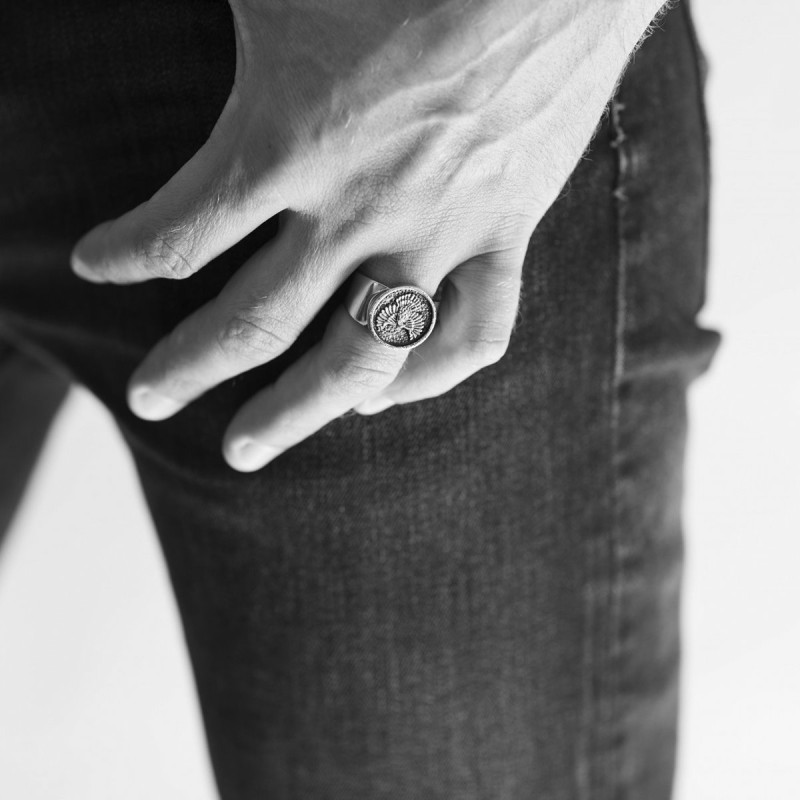 Par sa taille imposante et son motif puissant, cette chevalière est faite pour être la pièce maîtresse d'un look. Elle s'harmonise parfaitement avec une tenue décontractée comme un jean et un blouson en cuir, mais peut aussi apporter un contraste intéressant à un costume plus classique. Elle est idéale pour un port quotidien, résistant aux défis du temps grâce à l'acier.