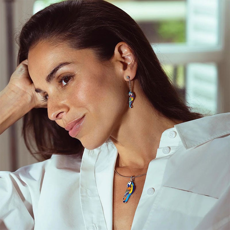 Avec leurs 5 cm de hauteur et 1 cm de largeur, ces boucles pendantes offrent un port léger (6,5 g) et un effet visuel saisissant, idéal pour illuminer le visage avec raffinement. Le fermoir poussette assure maintien et confort, tandis que la silhouette allongée du perroquet confère un mouvement gracieux à chaque geste. Un design pensé pour les femmes libres et passionnées, à la recherche d’un bijou singulier et expressif.
