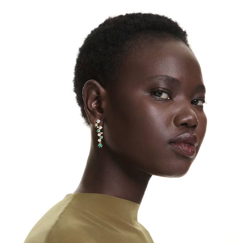Elles sont réalisées en métal au placage de ton or, assurant une chaleur lumineuse durable. Elles sont ornées de cristaux incolores et de Swarovski Zirconia verts, chacun mis en valeur par un sertissage griffes ou chaton pour maximiser leur brillance. Leur taille est de 3,9 x 1 cm, offrant un pendant élégant, et leur poids de 4,3 g chacune assure un confort optimal.