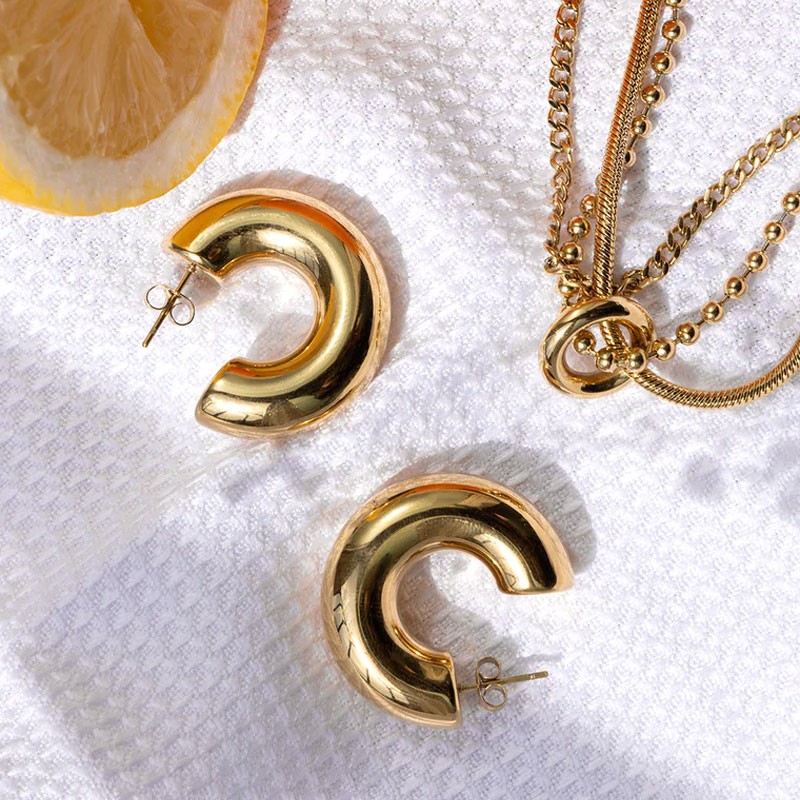 Ces créoles sont réalisées en acier et dorées à l'or fin par ionisation, leur conférant un éclat brillant et une excellente durabilité. D'une taille modeste (diamètre de 30 mm), elles se distinguent par leur épaisseur notable (10 mm) et leur forme en C ouverte, qui leur confère une silhouette superbe et contemporaine.