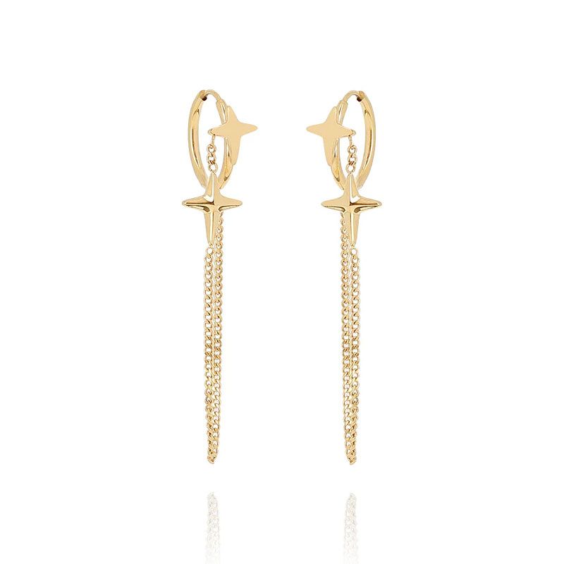 Le design de ces boucles d'oreilles repose sur l'attrait d'une composition aérienne : une petite créole à laquelle est suspendue une chaînette fluide portant une croix en acier doré. Cette association apporte une touche de modernité et de mouvement à l'ensemble. Pensé pour offrir une silhouette élancée, ce bijou a beaucoup d'allure et a été conçu pour garantir un confort optimal tout au long de la journée.