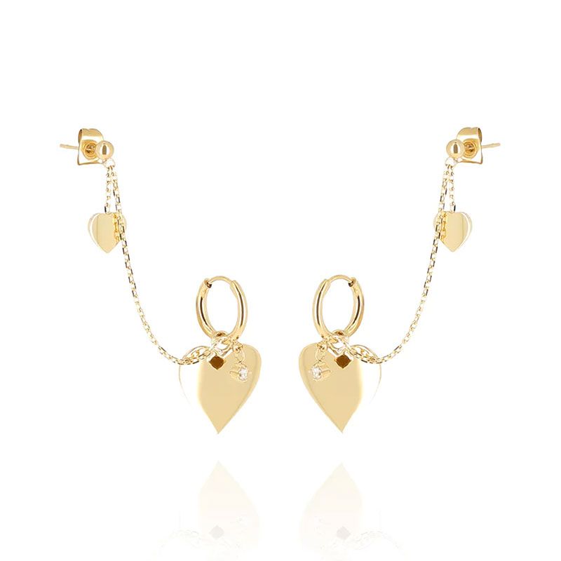Le design de ces boucles d'oreilles repose sur une composition originale et audacieuse : un piercing classique relié à une petite créole par une fine chaînette fluide. L'ensemble est orné de zirconiums étincelants et de pendentifs en forme de cœur de tailles différentes, créant un effet de cascade sophistiqué. Cette association apporte une touche de modernité "rock-chic" et un mouvement gracieux à votre silhouette.