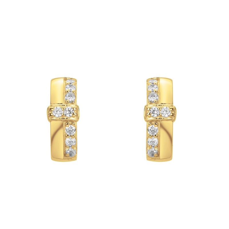 Façonnées en plaqué or lumineux, ces demi-créoles exhibent un pavage d'oxydes disposés stratégiquement sur les différents niveaux de la structure. Les pierres scintillantes, alternant entre tailles rondes et baguettes, composent un rythme visuel dynamique qui accroche le regard sous tous les angles. Le système de fermeture à poussette assure un port confortable et sécurisé, permettant à ces bijoux architecturaux de suivre chaque mouvement avec grâce.
