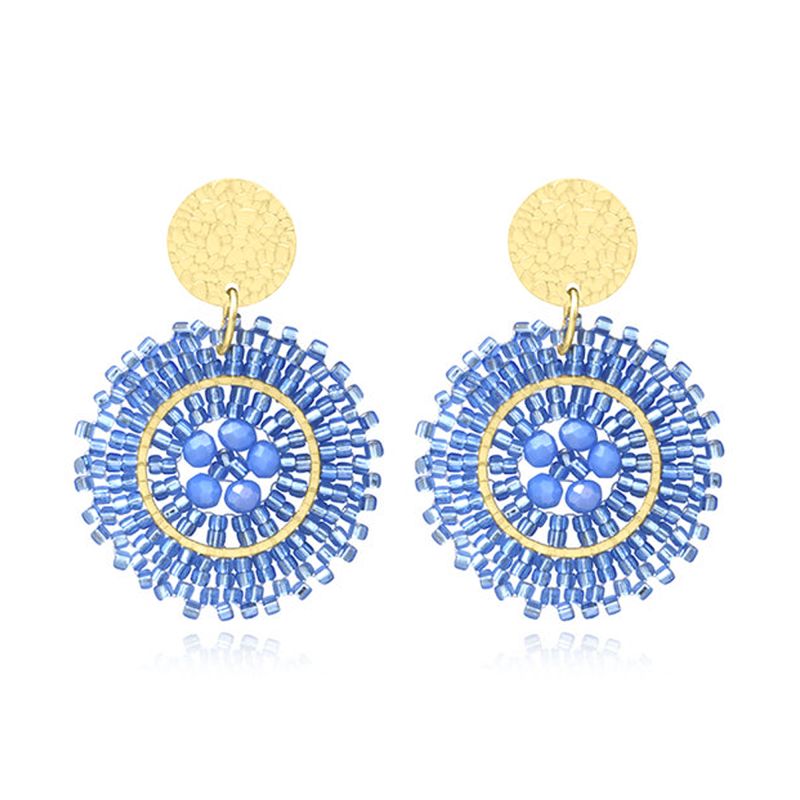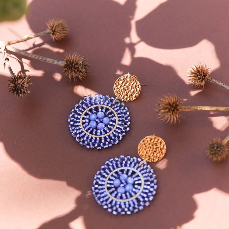 Le design de ces boucles d'oreilles se distingue par une rosace délicate, véritable témoignage d'un savoir-faire artisanal. Chaque pièce est tissée manuellement avec un fil transparent, assemblant avec précision des perles et des cristaux de verre aux nuances bleu céleste. Le cœur de la boucle dévoile une fleur de cristaux aux reflets doux, entourée d'un fin cercle doré et d'une corolle de perles translucides, évoquant la clarté d'un ciel d'été.