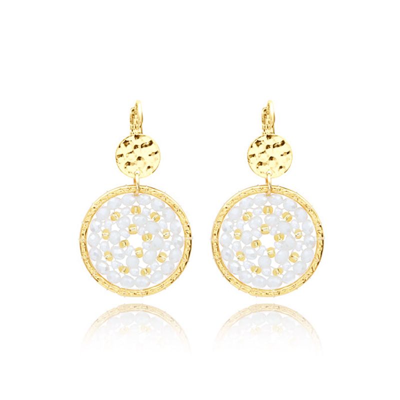Véritable prouesse de savoir-faire, ce modèle repose sur une pièce circulaire tissée à la main avec une précision d'orfèvre. Grâce à l'utilisation d'un fil transparent presque invisible, des perles et des cristaux de verre aux nuances blanc nacré et doré s'assemblent pour former une rosace vibrante qui capte la lumière au moindre mouvement. Le design est parachevé par un élégant fermoir dormeuse martelé, qui assure à la fois confort et sécurité tout en ajoutant une touche de texture organique.