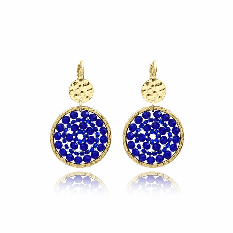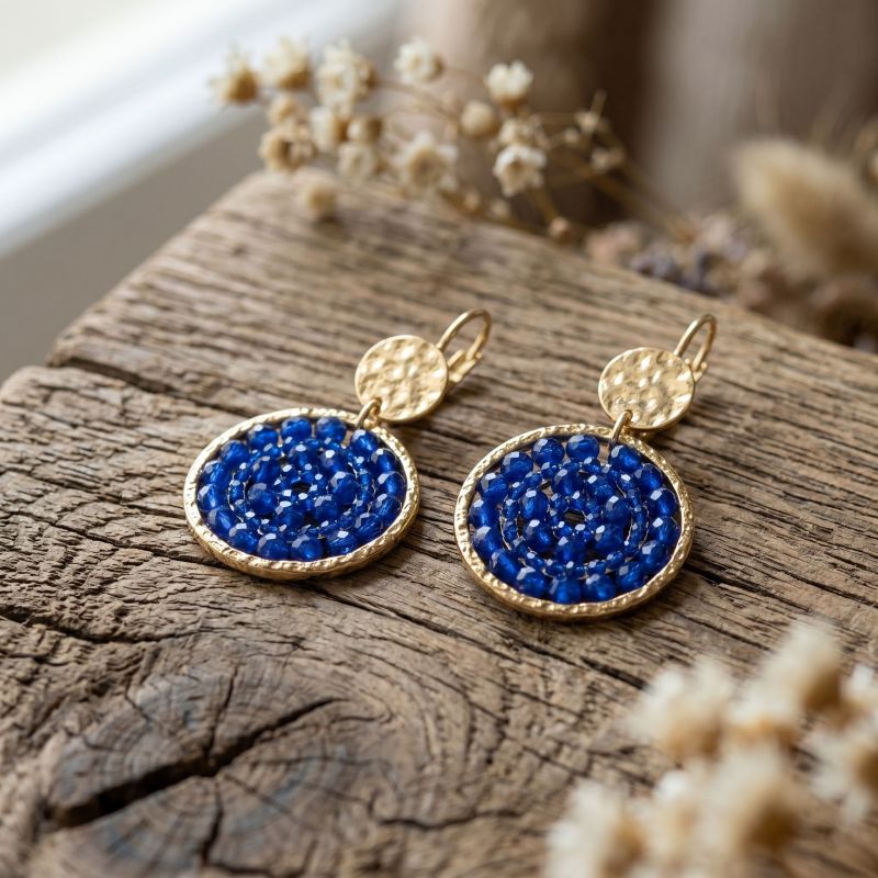Le design de ces boucles repose sur une rosace centrale tissée à la main avec une précision d'orfèvre. Grâce à un fil transparent presque invisible, une multitude de perles et de cristaux de verre d'un bleu azur intense sont minutieusement assemblés pour capturer et refléter la lumière à chaque mouvement. Le raffinement de ce bijou est souligné par une attache dormeuse martelée, qui apporte une touche de texture organique tout en assurant un confort de porté optimal.