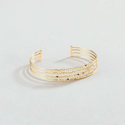 Les lignes dorées, fines et aériennes, sont sublimées par un travail minutieux de perles métalliques facettées glissées sur chacun des fils. Ces éléments rythment la structure de la manchette comme une partition élégante, captant la lumière à chaque mouvement. Le design ouvert s’adapte confortablement à la forme du poignet, offrant un équilibre parfait entre raffinement et modernité.