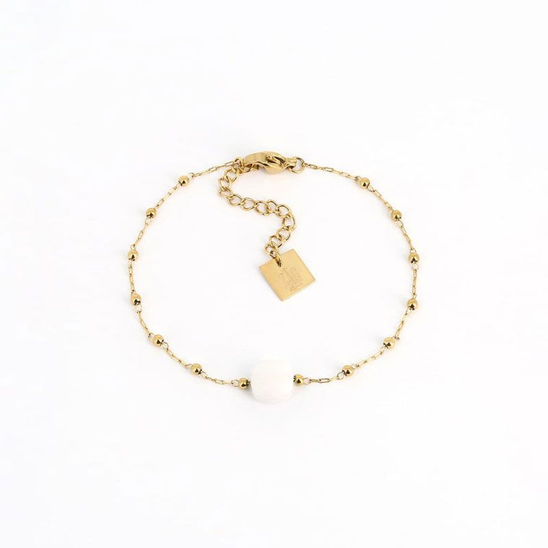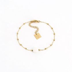 Le bracelet Pablo de ZAG Bijoux est un modèle raffiné qui séduit par son design délicat et intemporel. Réalisé en acier doré à l’or fin, ce bracelet chaîne « chapelet » est orné d’une pierre naturelle facettée blanche, subtilement mise en valeur par des petites perles dorées qui ponctuent la chaîne avec élégance.