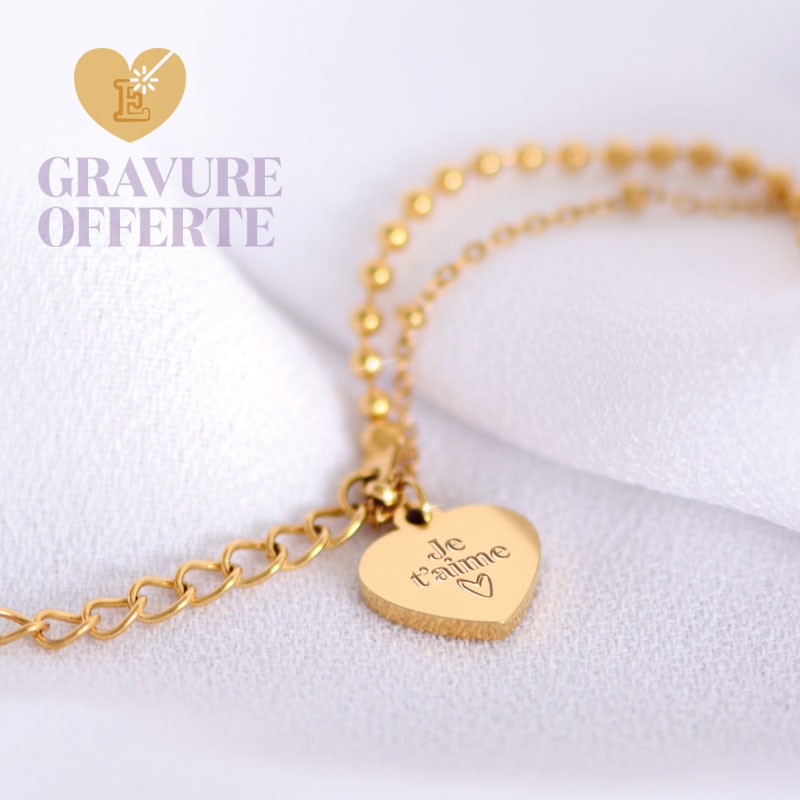 Réalisé en acier inoxydable 316L, ce bracelet existe en finitions dorée ou argentée, au choix. Son médaillon cœur peut être personnalisé avec une gravure OFFERTE, pour y inscrire un prénom, une date, ou tout simplement un “Je t’aime”. Une chaîne double et perlée, à la fois délicate et moderne, vient sublimer le poignet avec une touche élégante et intemporelle.