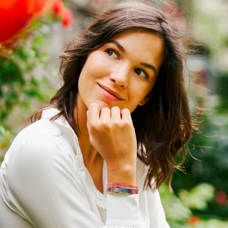 Ce bijou marin au style bohème chic se marie parfaitement avec une robe blanche, un haut bleu marine ou un accessoire fuchsia. Sa surface vibrante et graphique capte la lumière comme les reflets des vagues sur les rochers. Il se porte seul pour une allure estivale raffinée ou en accumulation avec d’autres joncs colorés LOUISE’S GARDEN, pour composer un style solaire et vivant. Chaque mouvement du poignet semble prolonger les ondulations calmes de l’océan.