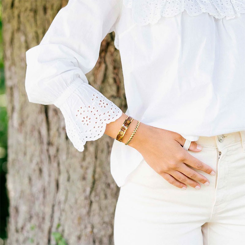 Inspiré des premiers éclats du matin, le jonc Perles de Rosée signé LOUISE’S GARDEN évoque la magie de l’aube et la beauté éphémère de la nature. Réalisé en acier inoxydable doré 316L, hypoallergénique et sans nickel, ce bracelet fin de 0,5 cm, pour un diamètre de 6 cm et un poids de 10 g, s’ajuste délicatement au poignet par simple pression.