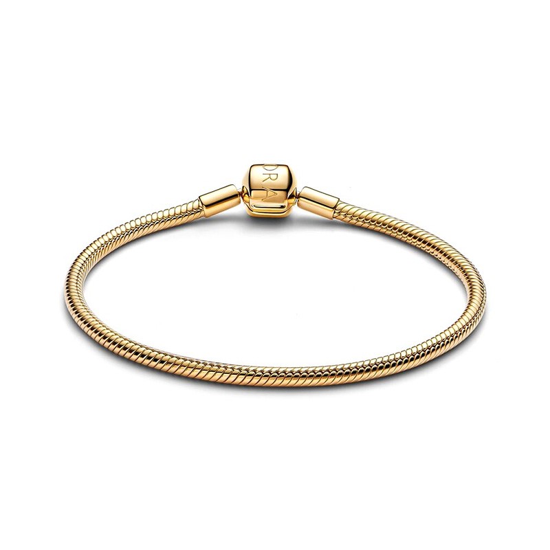 Travaillé à la main selon l'excellence Pandora, ce bracelet présente une maille serpent classique avec le fermoir barillet signature qui s'ouvre d'un simple mouvement de rotation. La dorure à l'or 585/1000e assure un éclat doré chaleureux et durable, créant une base luxueuse pour vos charms. Le fermoir barillet, élément distinctif de l'ADN Pandora, allie sécurité et facilité d'utilisation dans un design intemporel.