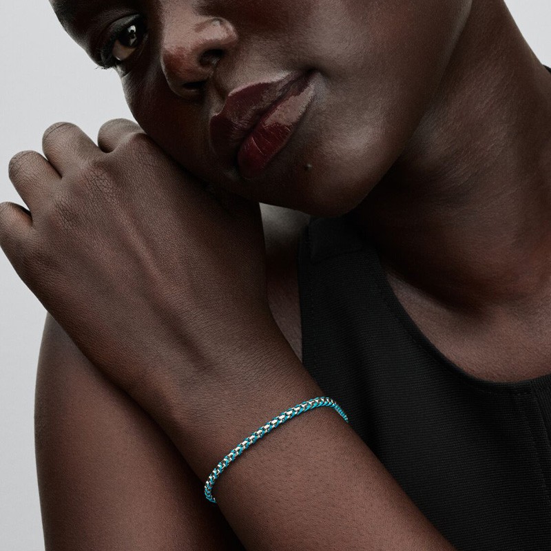 Idéal pour celles qui recherchent une alternative colorée et moderne au bracelet traditionnel, cette création maille serpent cordon bleu apporte une touche de fraîcheur marine à toute collection de charms. Un bijou qui marie innovation textile et tradition joaillière avec audace, disponible sur votre bijouterie en ligne EDORA.