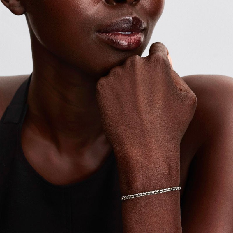 Fini à la main selon l'excellence Pandora, ce bracelet présente une maille serpent texturée qui crée un effet visuel saisissant. L'argent massif 925/1000e assure durabilité et éclat durable, tandis que la largeur généreuse du bracelet en fait une pièce centrale qui ne passe pas inaperçue. Le fermoir rond garantit une fermeture sécurisée tout en s'intégrant harmonieusement dans le design fluide de la maille.